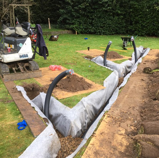 Following the development of a new house to the rear of our clients it has resulted in the gardens to 2 properties being flooded every winter meaning the gardens were inaccessible. It was for this reason a drainage engineer had designed a french drainage system with herringbone runs to collect the ground water in the gardens and discharge into the combined sewer. Our client had instructed us to install 160m of french drainage to 2 properties then coming through the garage and constructing a manhole within the driveway over the existing sewer to make connection of the new drain. Due to access restrictions into the garden we were only able to use a micro excavator and lots of trips with the wheel barrows with soil and shingle!